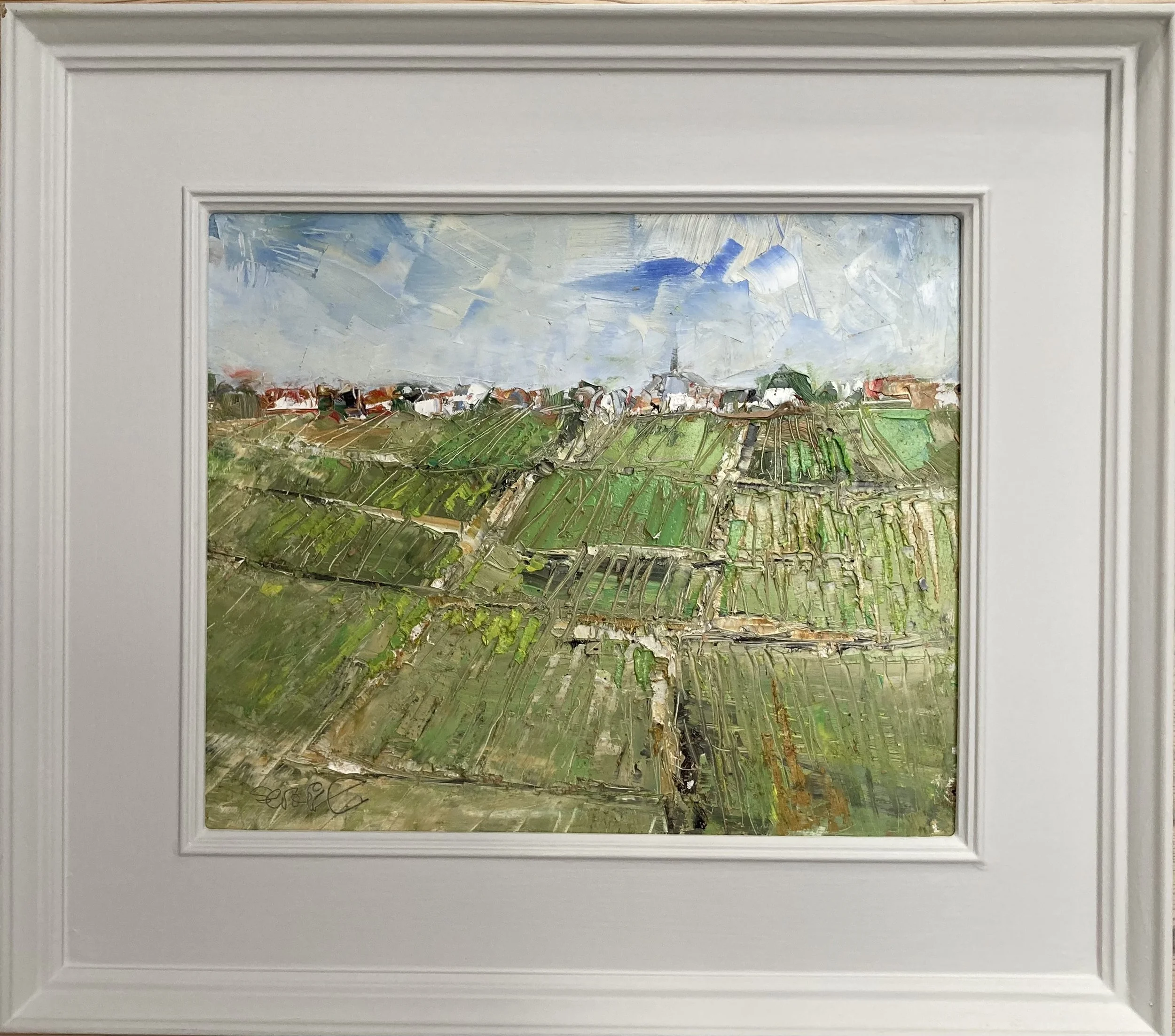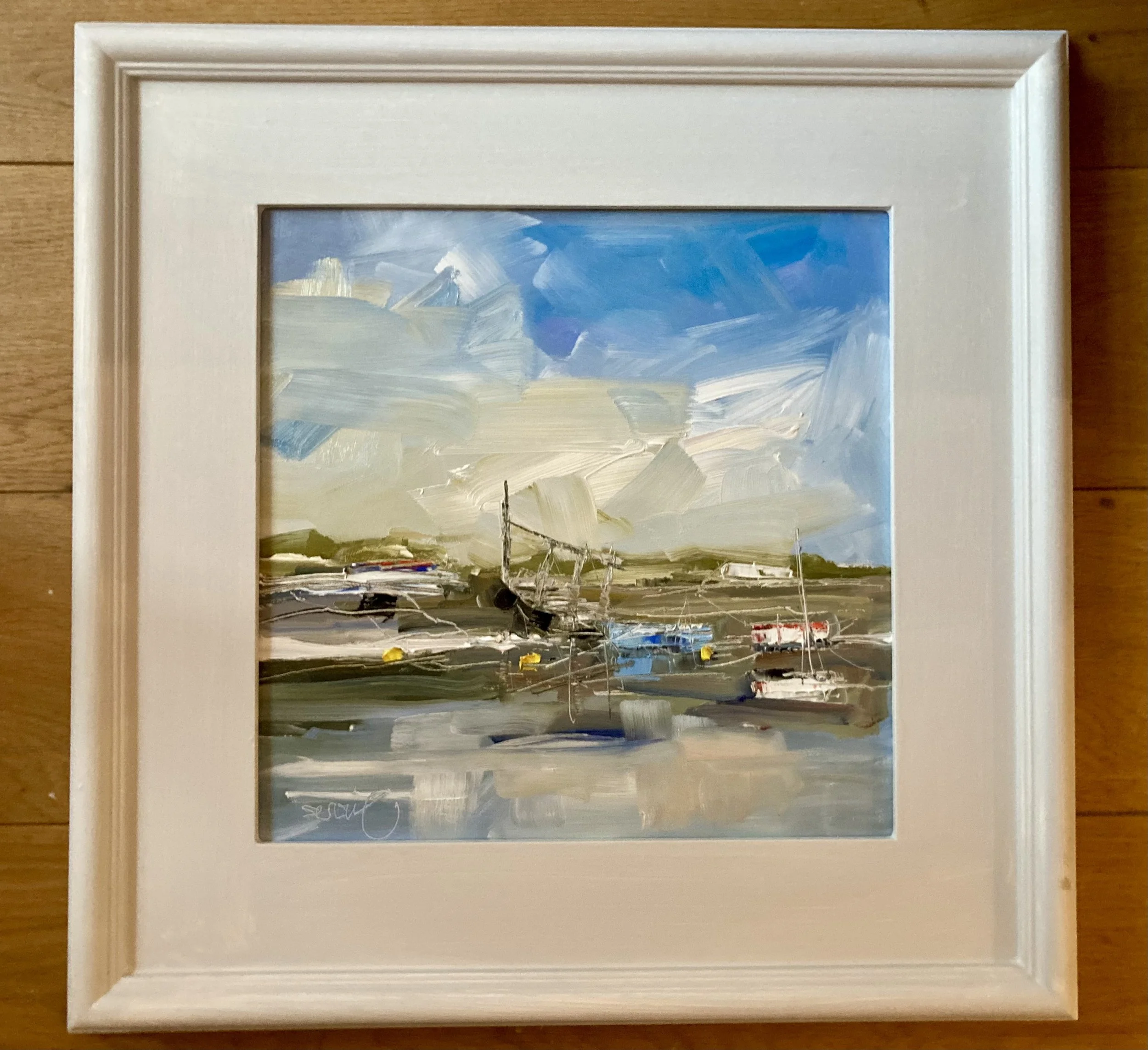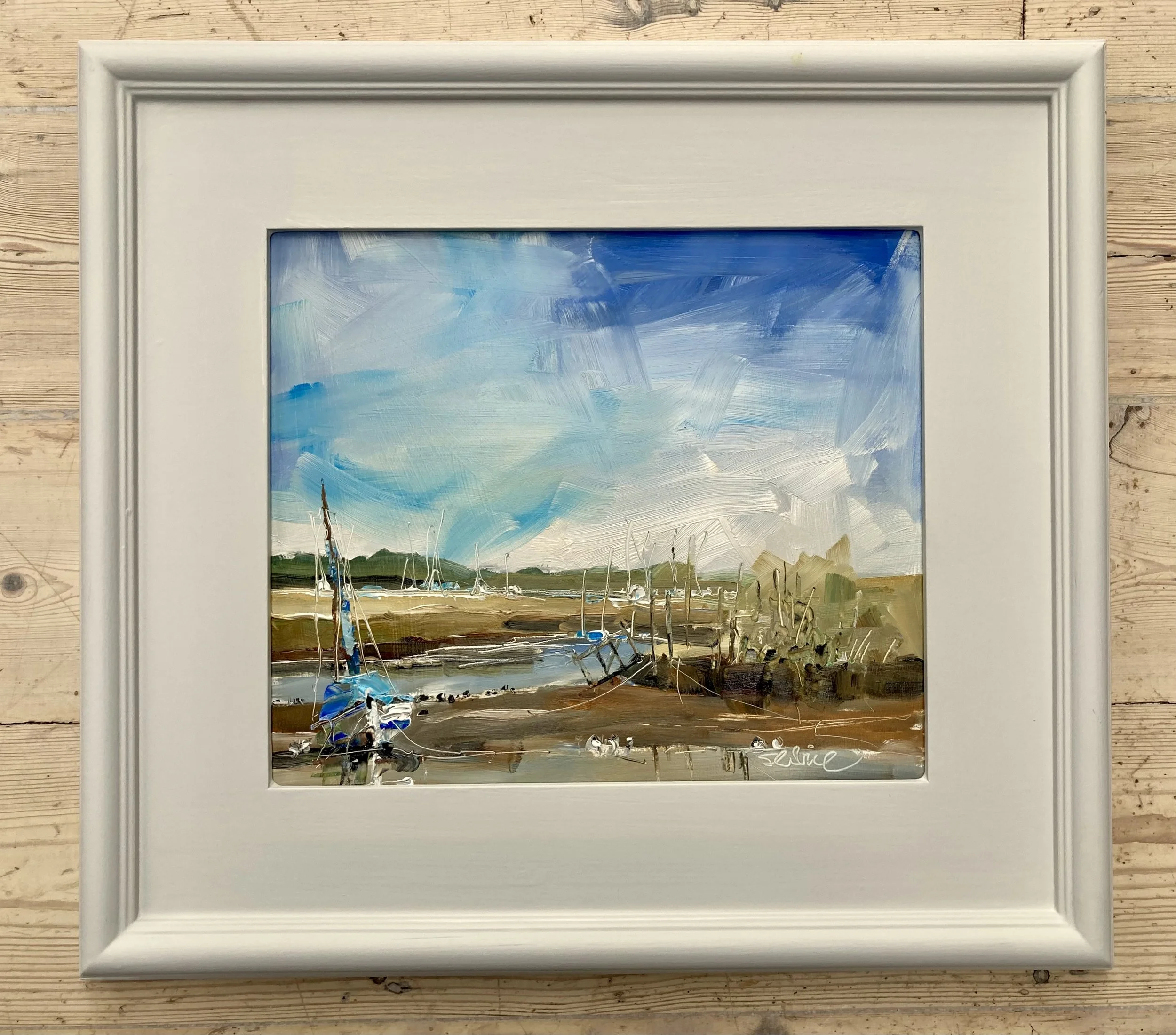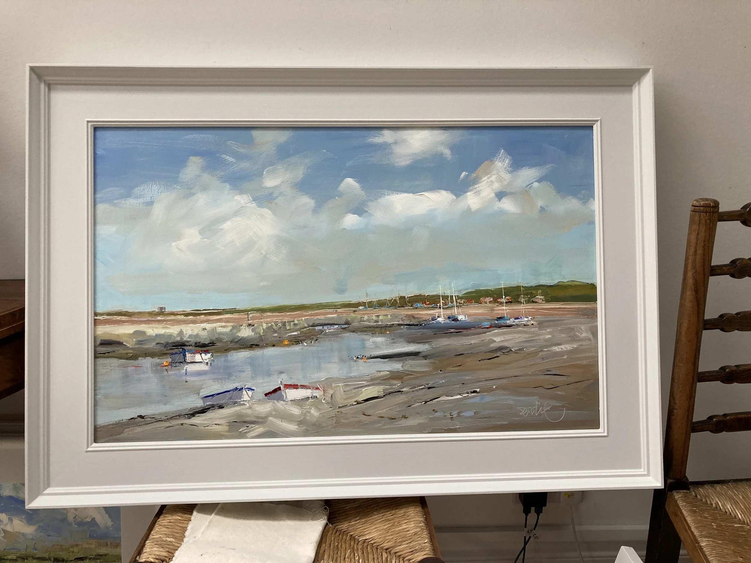 I paint what I see “but not necessarily in the right order”.  Landscapes, clouds, the sea and boats, muddy fields, tumbledown buildings and still  life, usually flowers in pots.